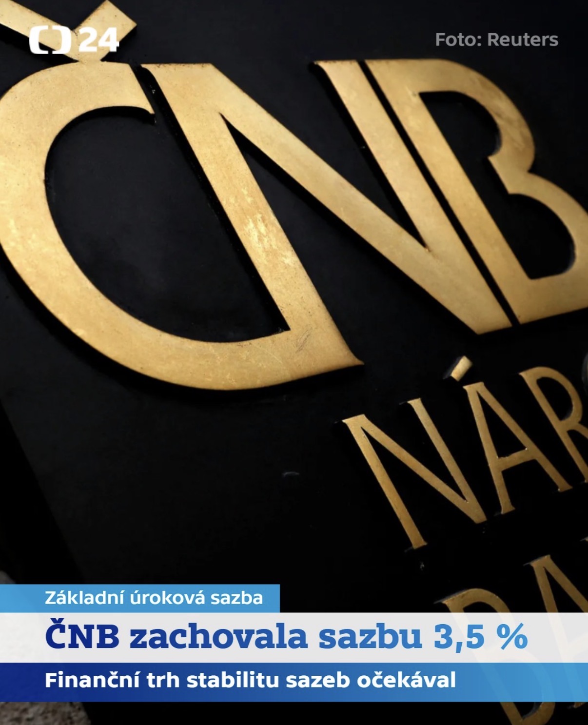 Bankovní rada České národní banky (ČNB) ponechala základní úrokovou sazbu beze změny na úrovni 3,5 %. Toto rozhodnutí má přímý dopad na úrokové sazby hypoték, spotřebitelských úvěrů i bankovních vkladů.